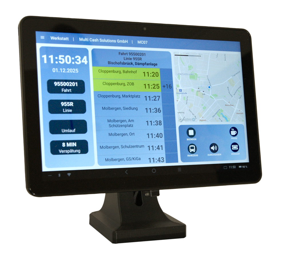 Das mobile Verkaufsgerät ist durch seine Vielseitigkeit und Flexibilität das ideale Verkaufs- und Kontrollgerät für Ihren SEV und und eine optimale Ergänzung zum Bordrechner MC MOVE+ SEV. Das Gerät kombiniert ein leistungsstarkes Android-Tablet mit einem hochwertigen Thermodrucker und einem mobilen Zahlterminal.